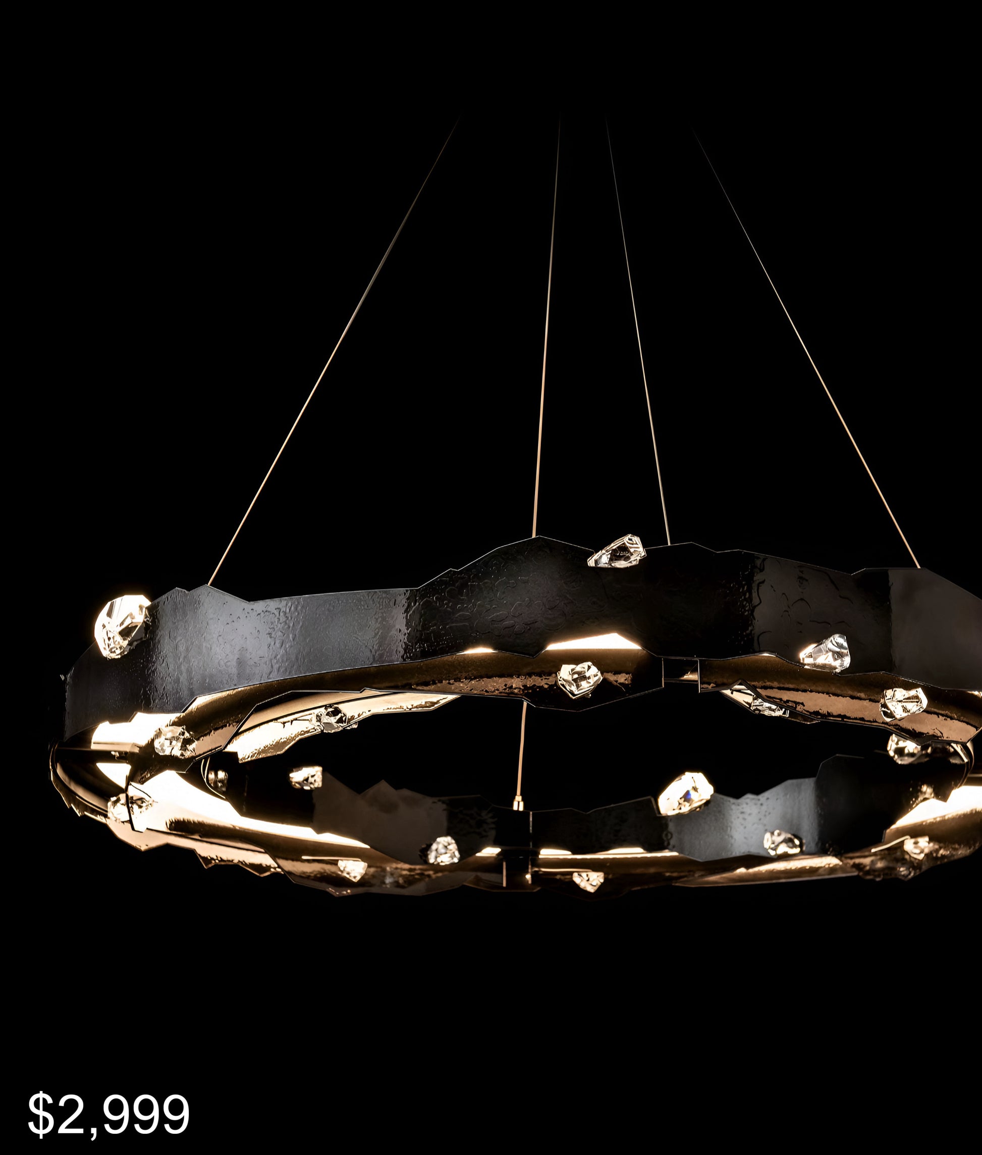 A masterpiece of craftsmanship, the Eclipse Forge Chandelier is hand-forged from blackened steel, creating a bold and sculptural silhouette. Embedded with precision-cut crystal accents, it reflects light in a mesmerizing, celestial glow. Suspended elegantly on fine cables, this piece blends industrial artistry with modern luxury, perfect for high-end interiors seeking statement lighting.