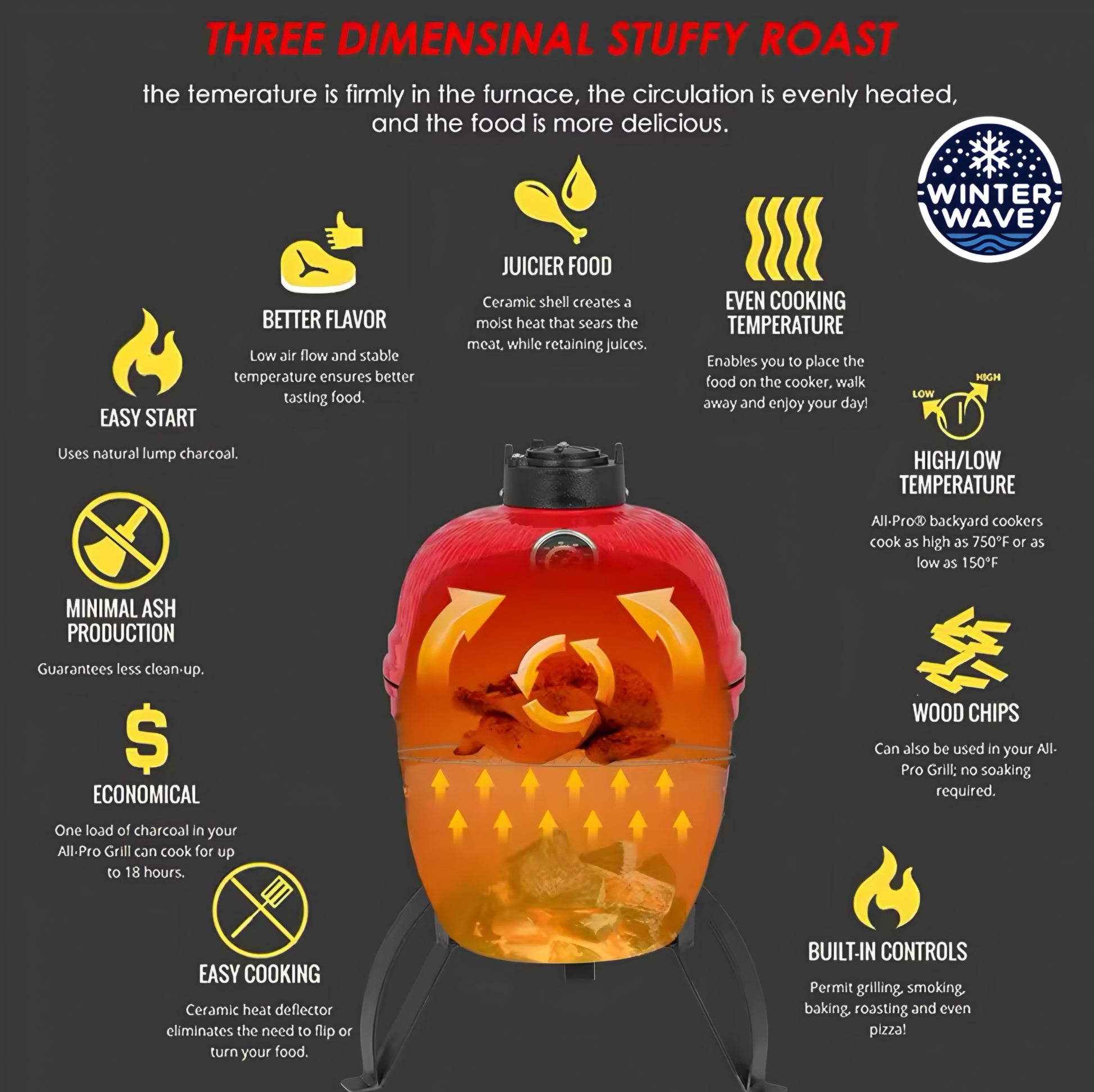 Our Kamado Grill features a 13 inch cooking surface, perfect for grilling up meats, veggies, and more. With its ceramic construction and precise temperature control, your food will come out juicy and flavorful every time. Whether you're a beginner griller or a seasoned pro, this grill is sure to impress.
